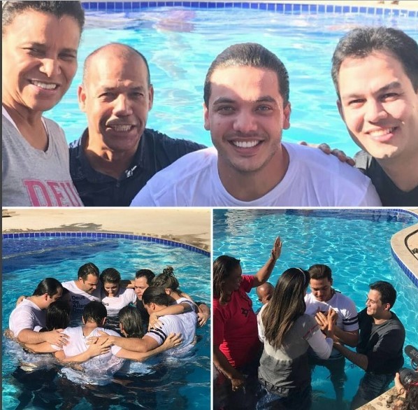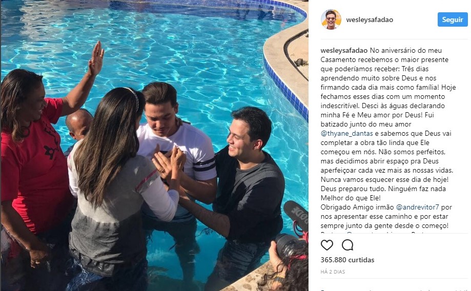 O cantor Wesley Safadão usou o Instagram para compartilhar o momento do batizado durante retiro espiritual de uma igreja Evangélica, na última quinta-feira (3). Ao lado da esposa, Thyane Dantas, que também foi batizada, o artista se mostrou muito feliz durante a celebração nas águas realizada pelos pastores da Igreja Batista da Alagoinhas, Minas Gerais. O casal que tem frequentado os cultos evangélicos há mais de um ano, decidiu firmar aliança com Deus em comemoração ao primeiro aniversário de casamento.