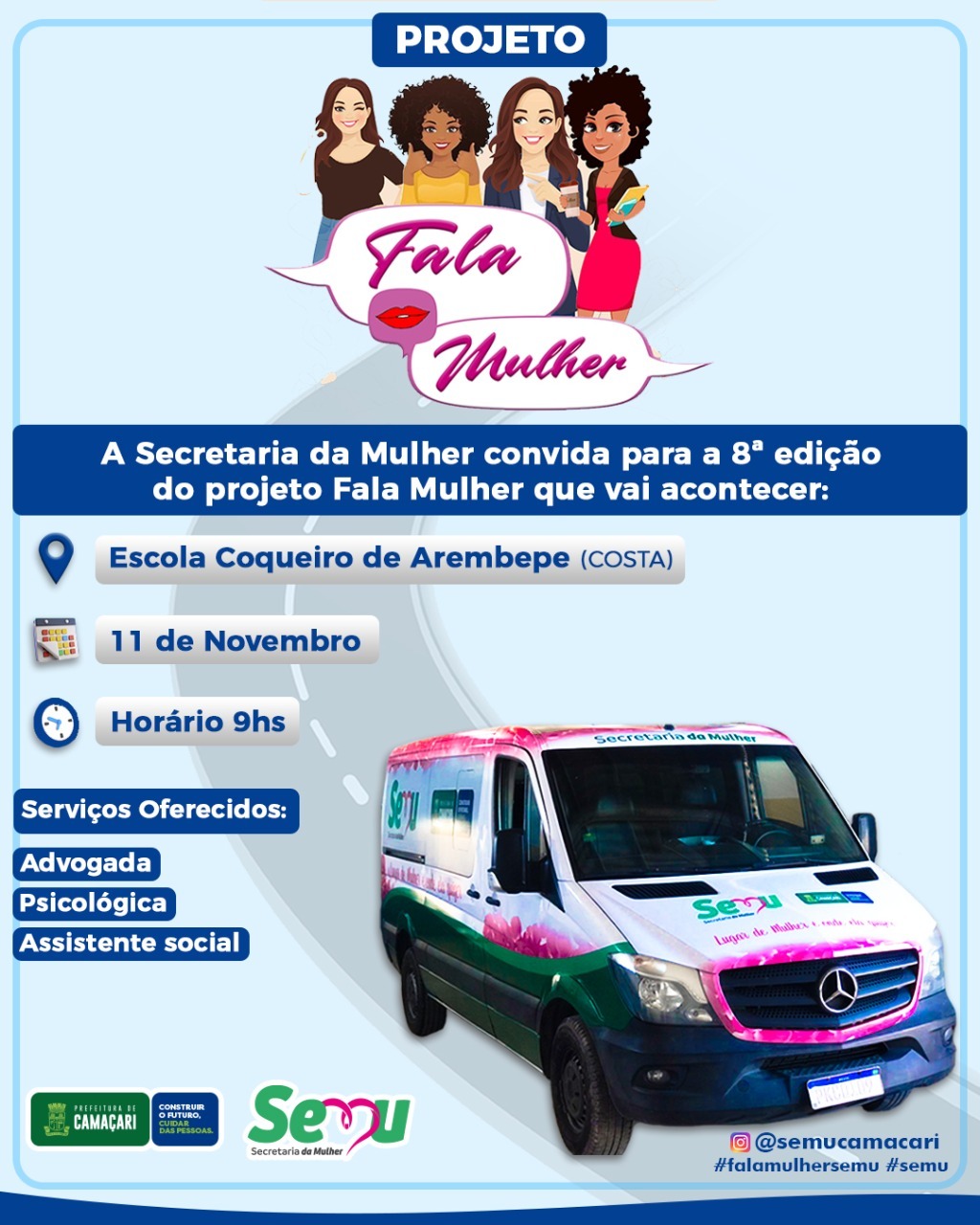 A Secretaria da Mulher (Semu), através do projeto itinerante Fala Mulher, visitará a localidade de Arembepe, Costa de Camaçari, na sexta-feira (11/11). O encontro será na Escola Coqueiro de Arembepe, a partir das 9hs. A pasta oferece durante a roda de conversa, atendimento de assistente social, psicóloga e advogada, que ficam à disposição para esclarecer dúvidas de mulheres vítimas de violência e prestar o atendimento necessário, sob total sigilo.
