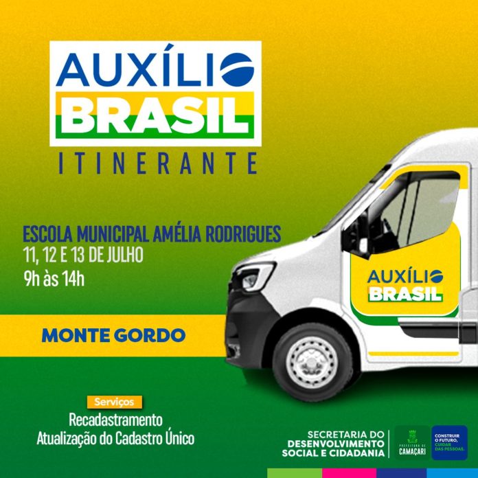 A Prefeitura de Camaçari, através da Secretaria do Desenvolvimento Social e Cidadania (Sedes), realiza, a partir da próxima segunda-feira (11/7), mais uma edição do projeto Auxílio Brasil Itinerante. Desta vez, a iniciativa contemplará a localidade de Monte Gordo, na costa do município. A ação acontecerá até quarta-feira (13/7) na Escola Municipal Amélia Rodrigues.