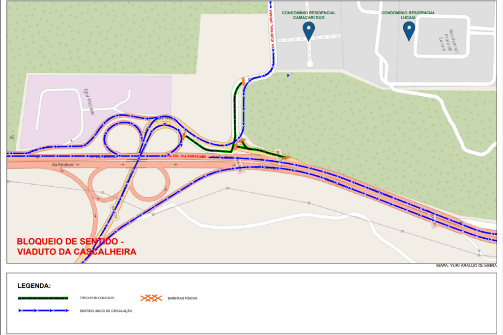 De acordo com o cronograma da Seinfra, a previsão de conclusão da intervenção é de 15 dias. Durante esse período, a STT esclarece que o tráfego no sentido contrário, ou seja, da Avenida Industrial Urbana, em direção à Via Parafuso e ao Trevo da Cascalheira, permanecerá liberado. No entanto, os condutores que trafegam pela Via Parafuso e desejam acessar a Industrial Urbana, devem seguir pelo Viaduto do Trabalhador, acessando a Avenida Jorge Amado, ou utilizar o acesso ao Boulevard Shopping Camaçari como rota alternativa.