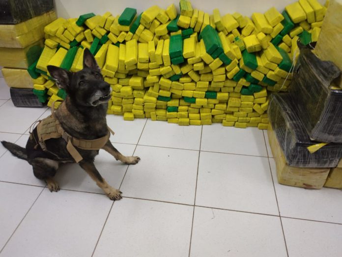 A cadela Kessi (Pastor Alemão), de 7 anos, lotada nas Rondas Especiais (Rondesp) Oeste, especialista em farejar drogas, foi fundamental na apreensão de 1,5 tonelada de maconha. Os entorpecentes apreendidos na última sexta-feira (17), estavam escondidos em um compartimento falso, na carroceria de um caminhão modelo VW.