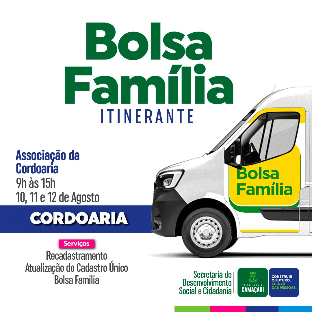 A Prefeitura de Camaçari, por meio da Secretaria do Desenvolvimento Social e Cidadania (Sedes), realiza a partir desta terça-feira (10/8), mais duas edições simultâneas do projeto Bolsa Família Itinerante. Desta vez, as localidades do Caminho do Mar e Cordoaria serão as contempladas.