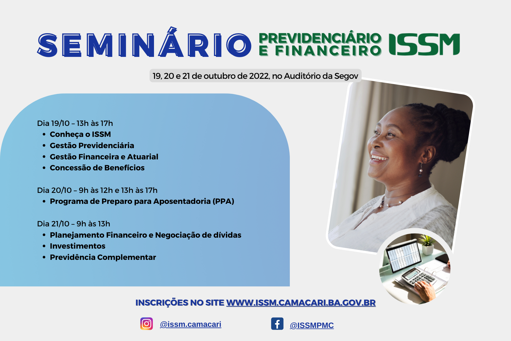 Estão abertas as inscrições para o Seminário Previdenciário e Financeiro ISSM, que será realizado nos dias 19, 20 e 21 de outubro, no Auditório da Secretaria de Governo (Segov). O evento, promovido pelo Instituto de Seguridade do Servidor Municipal (ISSM), destina-se aos servidores efetivos de Camaçari e tem como objetivo, disseminar informações sobre o funcionamento do órgão, benefícios previdenciários e educação financeira.