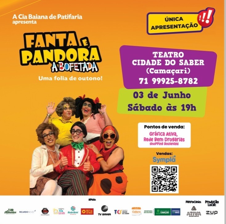 A Cia. Baiana de Patifaria retorna a Camaçari no mês de junho com única apresentação do espetáculo Fanta e Pandora – Uma Folia de Outono!, que leva ao palco as duas personagens de grande sucesso da icônica montagem A Bofetada. Contando com patrocínio da Secretaria da Cultura (Secult), o evento acontece no dia 3/6, às 19h, no Teatro Cidade do Saber, com ingressos a R$ 60 (inteira), R$ 30 (meia) e R$ 80 (casadinha). A aquisição pode ser feita de forma on-line pelo Sympla, ou presencialmente na Gráfica Ativa e na Rede Bem Drogaria, localizada no Boulevard Shopping.