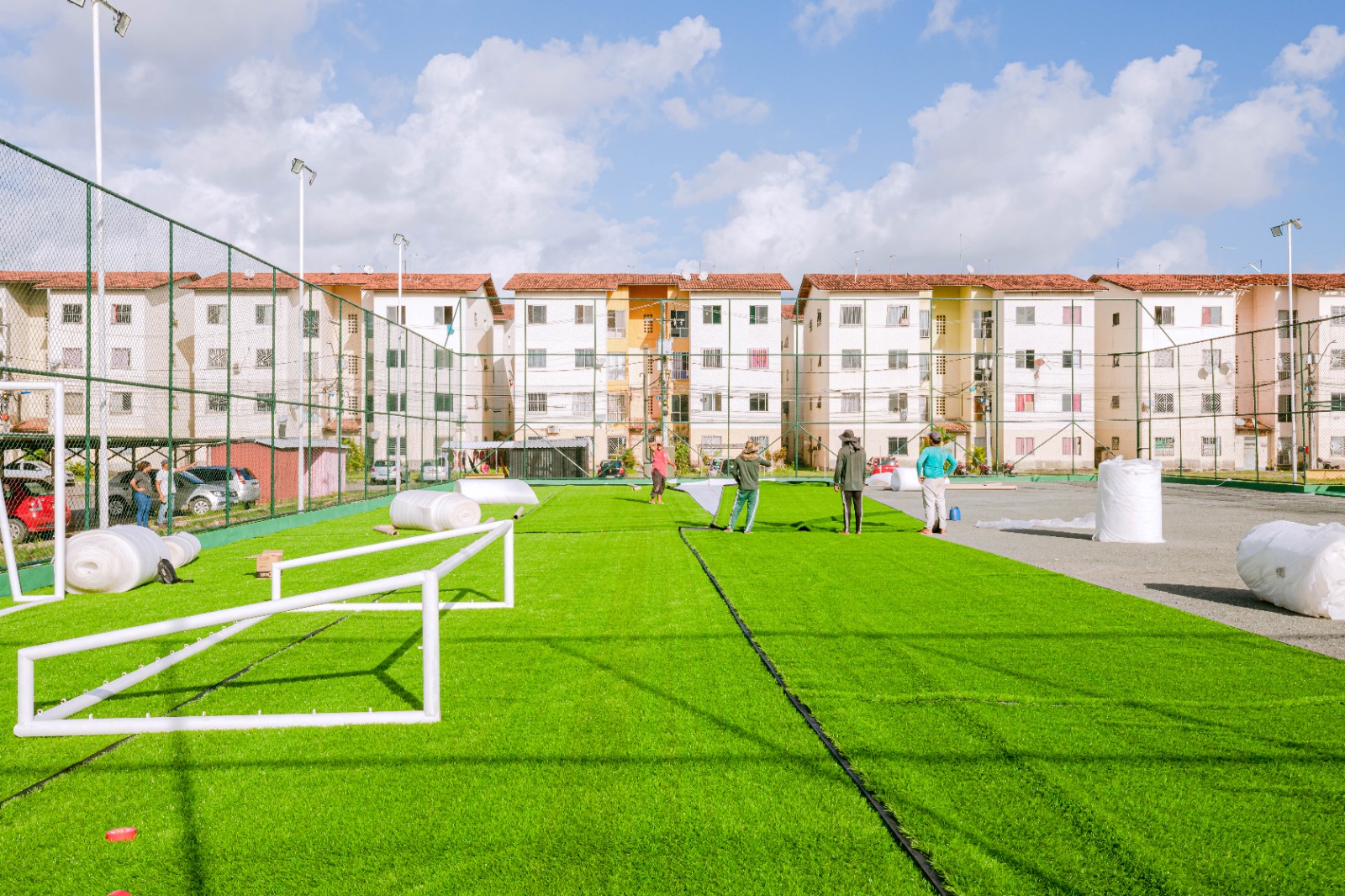 O novo campo da região do Residencial Parque das Algarobas III, localizado no bairro Santa Maria, já está recebendo a instalação da grama sintética. O avanço nos serviços de requalificação representa um progresso significativo no desenvolvimento das obras do equipamento esportivo.