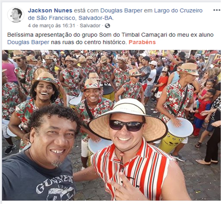 Mestre Jackson fez questão de postar em sua rede social, a satisfação de ter encontrado com o ex-aluno em belíssima apresentação da banda no Carnaval.