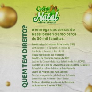 A comemoração de fim de ano para a população carente da cidade será diferente este ano. É que a Prefeitura de Camaçari, por intermédio da Secretaria de Desenvolvimento Social e Cidadania (Sedes), vai garantir a cesta de Natal à população cadastrada nos programas sociais Bolsa Família, além dos demais executados no município.