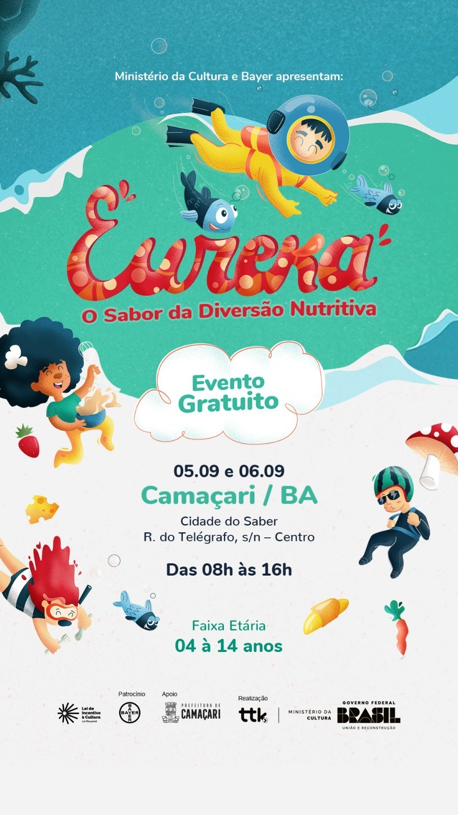 Oportunidade para o público infantojuventil se encantar com novos sabores e aprender sobre alimentação saudável de forma divertida. Isto porque, 1.200 crianças e adolescentes de 4 a 14 anos, poderão participar do projeto Eureka, que promove atividades gratuitas, na Cidade do Saber, nesta terça e quarta-feira (5 e 6/9), das 8h às 16h. O evento conta com apoio da Prefeitura, através da Secretaria da Cultura (Secult).
