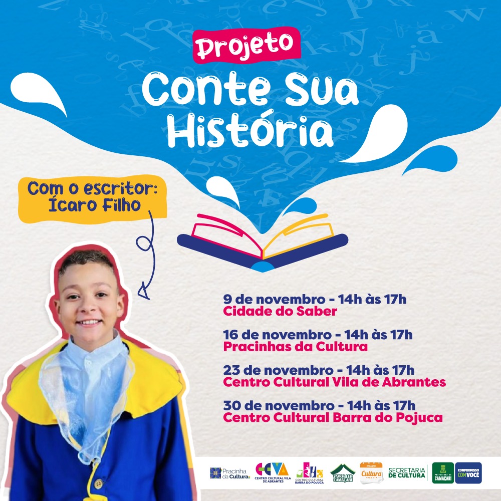 Com a ideia de fazer o público infantojuvenil viajar pelo mundo literário, o projeto Conte Sua História promoverá uma série de encontros com o jovem escritor Ícaro Filho, de 11 anos, autor do livro Reino Encantado de Uma Cor Só e idealizador da iniciativa. No dia 9 de novembro, a ação acontece na brinquedoteca da Cidade do Saber; no dia 16, na Pracinhas da Cultura; dia 23, no Centro Cultural Vila de Abrantes; e no dia 30, no Centro Cultural Barra do Pojuca. Em todos os espaços, as atividades serão realizadas das 14h às 17h.