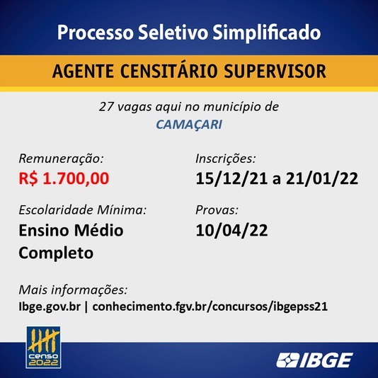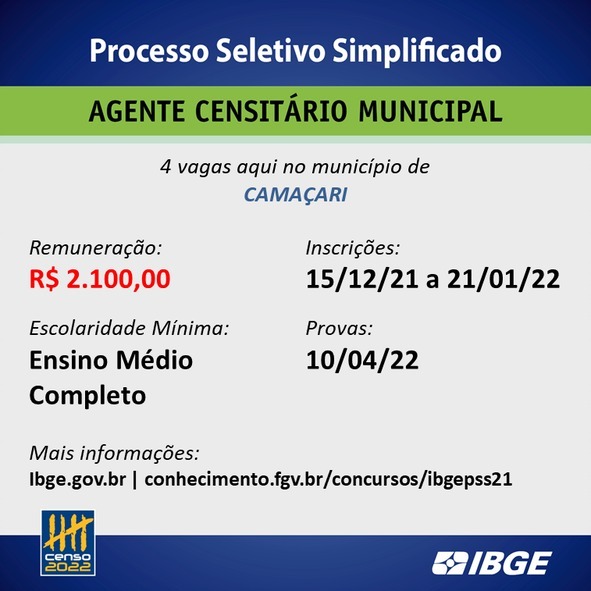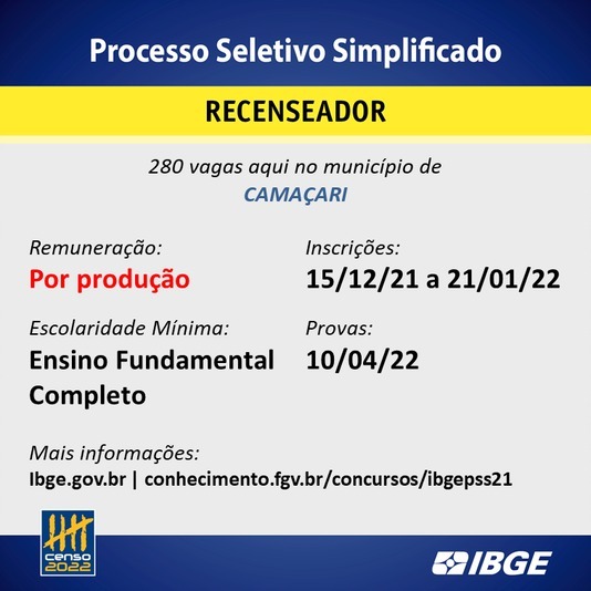 Para a seleção ainda há a opção do cargo de Agente Censitário de Administração e Informática (ACAI), este com a inscrição mantida até o dia 10 de janeiro. No total, o processo oferta 14.290 vagas, sendo 313 em Camaçari, destas são: duas para ACAI, quatro para ACM, 27 para ACS e 280 vagas para Recenseador.