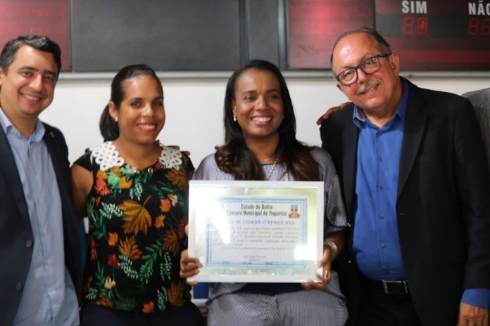 A presidente do PRB Bahia e deputada federal, Tia Eron recebeu neste sábado (11), o título de cidadã Itaparicana. A honraria foi indicada pela vereadora Naiane Souza (PRB) e aclamada por unanimidade pela Câmara de Vereadores. A homenagem prestada é um reconhecimento ao trabalho desenvolvido pela deputada, na Ilha de Itaparica.