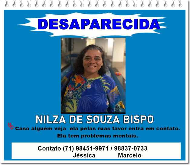 Nilza de Souza Bispo de 51 anos está desaparecida desde a manhã desta terça-feira (4/1). Familiares afirmam que ela foi vista pela última vez às 06:00h dentro de casa no bairro do Poch 3.