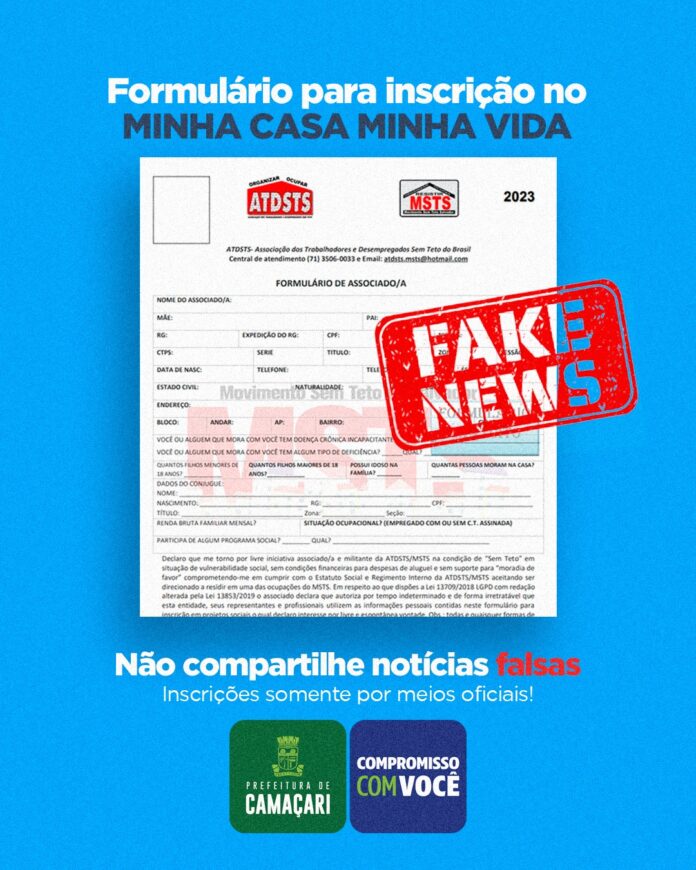 A Prefeitura de Camaçari, através da Secretaria da Habitação (Sehab), esclarece que é falso um formulário para inscrição no Programa Minha Casa Minha Vida (PMCMV) que circula em redes sociais não oficiais da administração pública.