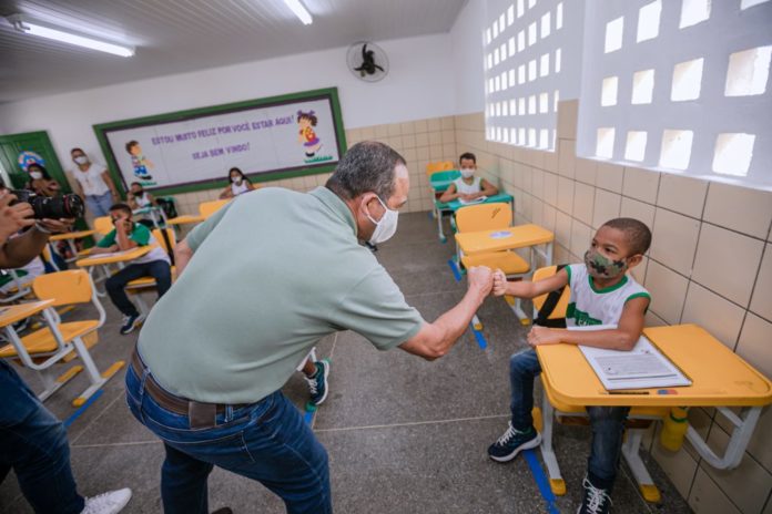 Para fiscalizar o cumprimento dos protocolos sanitários e pedagógicos, após quase 20 dias de retorno das aulas semipresenciais, o prefeito Elinaldo Araújo visitou três unidades escolares, na manhã desta sexta-feira (3/9). Acompanhado da secretária da Educação, Neurilene Martins, o gestor municipal esteve nas escolas municipais Joana Angélica e Helena Celestino de Magalhães, além do Centro Educacional do Gravatá.