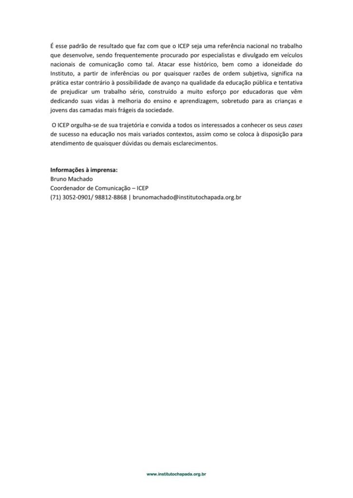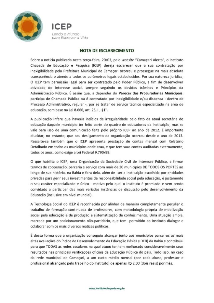 A secretaria da Educação de Camaçari contratou o Instituto Chapada de Educação e Pesquisa (ICEP) por inexigilidade por se tratar de serviço técnico especializado na área de educação. Essa forma de contratação está prevista na lei das licitações. A ICEP não atende apenas prefeituras de pequeno porte como tentam propagar os inimigos de Camaçari por clara motivação política. O instituto presta serviços a municípios de porte como Salvador, Vitória da Conquista e inúmeras outras cidades da Bahia e outros estados. Em relação ao “vinculo” que os detratores da Prefeitura de Camaçari tentam colocar entre a secretária de educação do município e a ICEP, baseado num “print” da internet, não é preciso usar lupa para verificar que Neurilene Martins foi formadora do Instituto em 2012 como mostra a referida publicação. Ela finalizou seu contrato com a instituição há mais de 4 anos, em dezembro de 2013, o que demostra a inexistência de interesse pessoal e explica o atendimento ao critério legal da confiança, já que a gestora conhece o trabalho de excelência do ICEP há mais de 5 ano, sempre apresentando ótimos resultados em favor da educação pública e de qualidade.