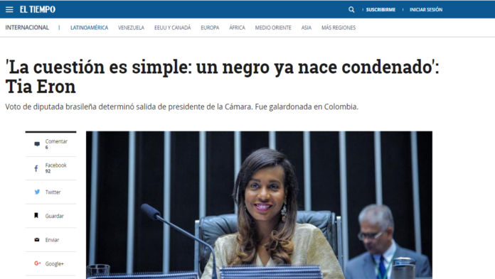 Com a frase ‘A questão é simples: um negro já nasce condenado’ :Tia Eron, acerca do racismo, a reportagem de âmbito internacional destaca o trabalho da deputada federal (PRB-BA) no Brasil, sendo assinada pela jornalista Valeria Cuevas Gonçavez, e publicada na última quarta-feira (30) pelo jornal colombiano, El Tiempo, um dos periódicos mais conceituados da América Latina.