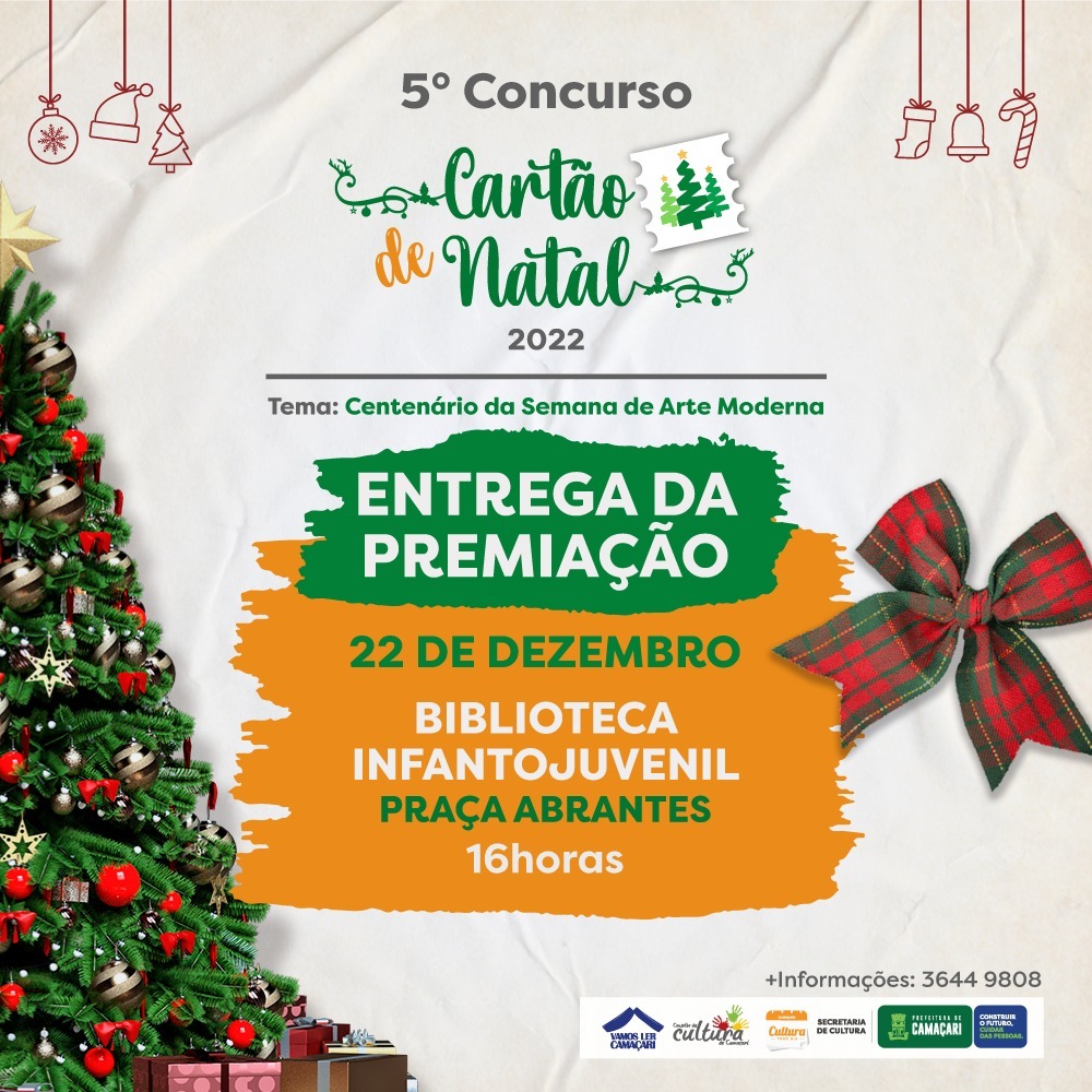 A entrega da premiação do 5º Concurso Cartão de Natal será feita pela Secretaria da Cultura (Secult) na próxima quinta-feira (22/12), às 16h, na Biblioteca Infantojuvenil, situada na Praça Abrantes. A ganhadora terá a mensagem e o desenho transformados no cartão de Natal da pasta municipal, além de ser presenteada com uma bicicleta. O segundo e terceiro lugar receberão um tablet, cada.