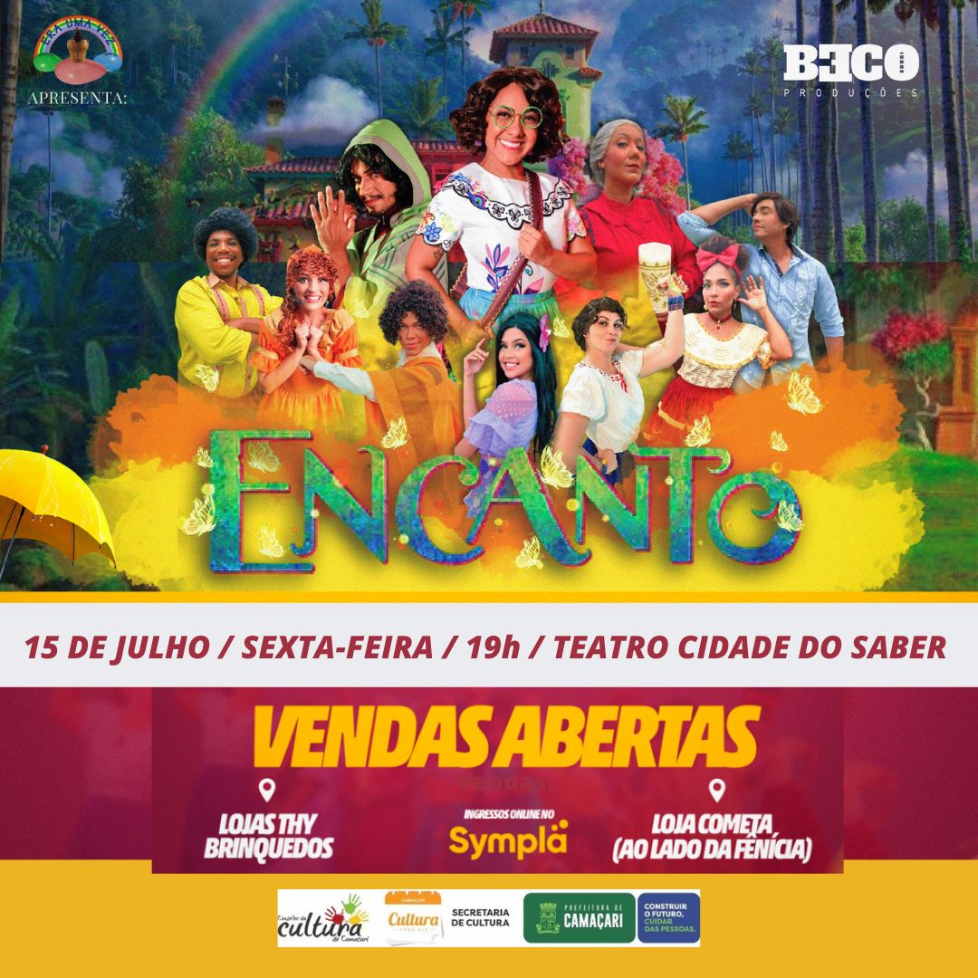 Pela primeira vez em Camaçari, o espetáculo infantil “Encanto – O Musical” é apresentado no Teatro Cidade do Saber, no dia 15 de julho, às 19h. Inspirado no filme da Disney, a produção da Cia. Era Uma Vez conta a história da família Madrigal, que vive em um vilarejo escondido nas montanhas da Colômbia, numa casa mágica situada em um local chamado Encanto.