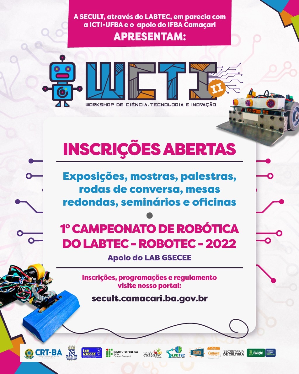Estão abertas as inscrições para o II Workshop de Ciência, Tecnologia e Inovação (WCTI), evento que acontece nos dias 20, 21 e 22 de outubro, na Cidade do Saber e no Instituto Federal de Educação, Ciência e Tecnologia da Bahia (IFBA). Promovido pela Secretaria da Cultura (Secult), através do Laboratório de Tecnologia de Camaçari (LABTEC), em parceria com o Instituto de Ciência, Tecnologia e Inovação (ICTI) da Universidade Federal da Bahia (UFBA), o evento inclui palestras, minicursos, mesa redonda e exposição de projetos científicos, além do 1º Campeonato de Robótica do LABTEC – ROBOTEC 2022.