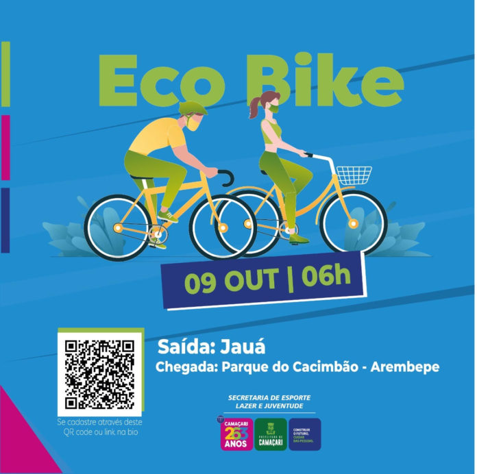 A prefeitura de Camaçari, por meio da Secretaria do Esporte, Lazer e Juventude (Sejuv), realizará no dia 9 de outubro, o Eco Bike – trilhão de aproximadamente 22 quilômetros (Km). As inscrições já estão abertas e seguem até o dia 7 de outubro, ou até preencher as 100 vagas disponibilizadas. Para se cadastrar, o interessado deve preencher um formulário on-line, através do link: https://forms.gle/bkvaoAiotB5CueGo9 ou por meio do QR Code, disponível no card abaixo.