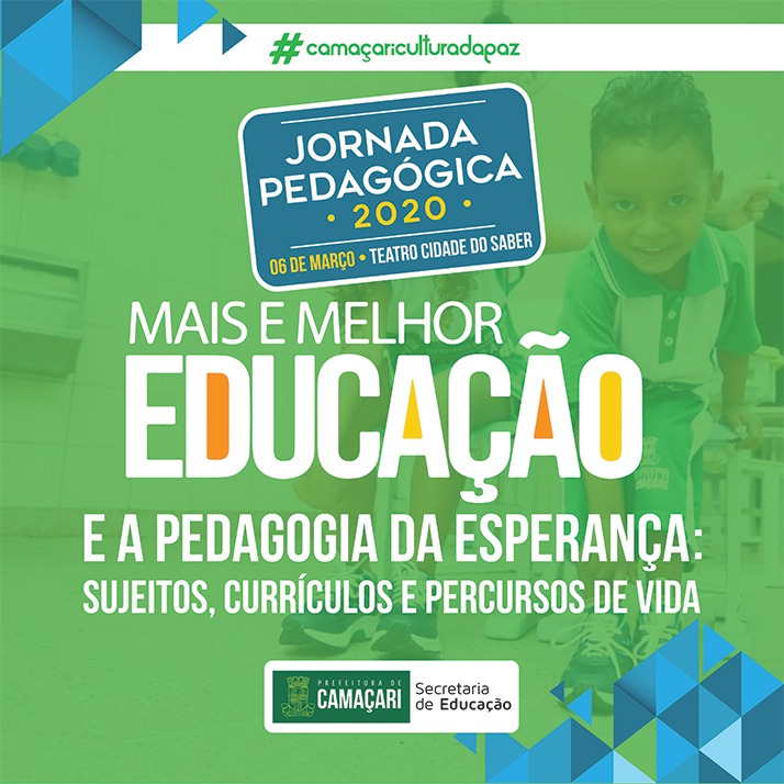 A Jornada Pedagógica 2020 é promovida pela Prefeitura de Camaçari, através da Secretaria da Educação (Seduc), e tem o intuito de mobilizar discussão sobre os avanços, desafios e possibilidades de potencialização dos processos pedagógicos para o ano letivo 2020. Com uma programação extensiva de qualificação para professores, coordenadores pedagógicos, gestores escolares e servidores não docentes, o evento traz o tema Mais e Melhor Educação e a Pedagogia da Esperança: Sujeitos, Currículos e Percursos de Vida.