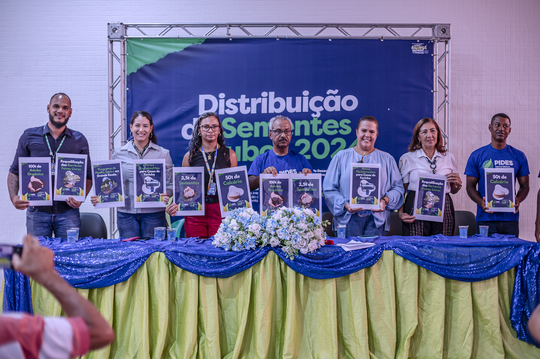 O auditório da Casa do Trabalho ficou lotado durante o evento de lançamento de ações do Programa Integrado de Distribuição de Equipamentos e Suprimentos (Pides) edição 2024, marcado pela distribuição de sementes e insumos a 400 produtores rurais. Realizada pela Prefeitura de Camaçari, por meio da Secretaria do Desenvolvimento da Agricultura e Pesca (Sedap), somada a 1 tonelada (t) de sementes de feijão entregue nesta terça-feira (12/3), ao todo, serão doados, diretamente nas propriedades rurais, 103,5 (t) dos produtos, entre 2,5 t de sementes de milho, 100 t de composto orgânico de torta de mamona, e 50 t de calcário.