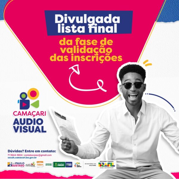 A Prefeitura de Camaçari, através da Secretaria da Cultura (Secult), divulgou a lista final de proponentes habilitados na fase de validação das inscrições no edital de concurso cultural Camaçari Audiovisual. O documento foi publicado por meio da resolução 02/2024, através do Diário Oficial do Município (DOM), edição n.º 2.342/2024, de 12 de março. Ao todo, foram recebidas 114 inscrições, divididas em cinco categorias: curta-metragem; vídeos e games; novas mídias; outras mídias 1; e outras mídias 2. Destes, 112 projetos foram habilitados.