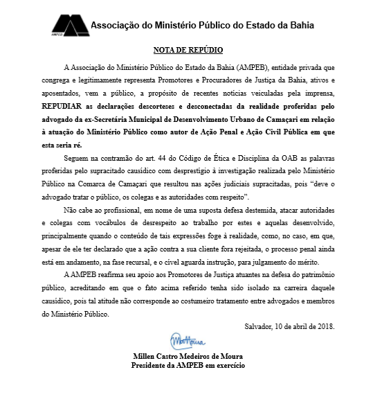Associação do Ministério Público do Estado da Bahia (Ampeb) emitiu de repúdio às “declarações descorteses e desconectadas da realidade proferidas pelo advogado da ex-Secretária Municipal de Desenvolvimento Urbano de Camaçari em relação à atuação do Ministério Público como autor de Ação Penal e ação Civil Pública em que esta seria ré”.