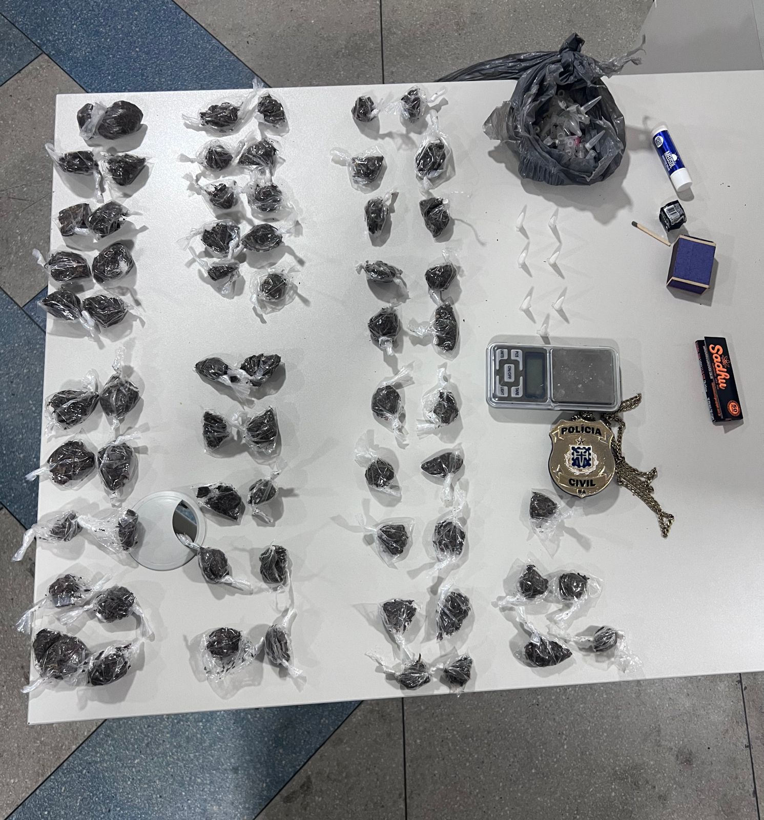 Sessenta e cinco porções de maconha, sete pinos de cocaína, uma balança e dezenas de pinos vazios foram apreendidos, na sexta-feira (10), em Camaçari, por equipes da 18ª Delegacia Territorial (DT) da cidade, que também cumpriram três mandados de prisão e recuperaram um carro roubado.