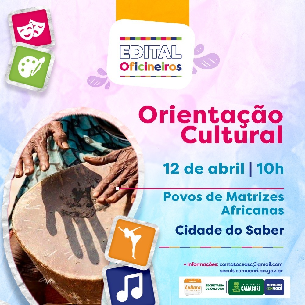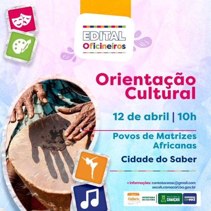 Nesta quarta-feira (12/4), às 10h, a Secretaria da Cultura (Secult) de Camaçari promove, na Cidade do Saber, orientação sobre o edital Oficineiros, voltada para os povos de matrizes africanas. A ideia é sanar eventuais dúvidas dos agentes culturais sobre o certame, lançado pela pasta em novembro de 2022.