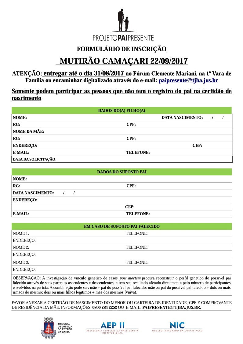 O formulário devidamente preenchido deve ser entregue 1ª Vara de Família de Camaçari ou através do e-mail: paipresente@tjba.jus.br