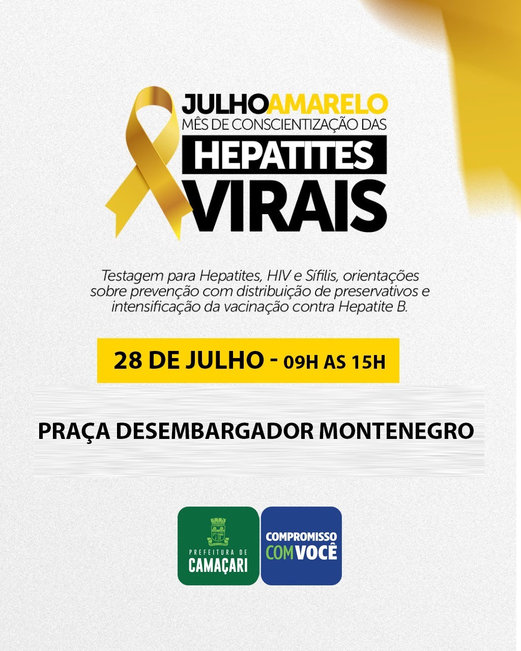 A Secretaria da Saúde (Sesau) de Camaçari realizará nesta sexta-feira (28/7) mais uma ação do Julho Amarelo, mês de combate e conscientização das hepatites virais. A atividade acontecerá na Praça Desembargador, no Centro, das 9h às 15h, e oferecerá serviços de testagem rápida para hepatites, HIV, sífilis; orientações sobre prevenção com distribuição de preservativos; e vacinação contra Hepatite B. A iniciativa é aberta à participação de todos. Ações semelhantes também ocorreram nas unidades de saúde da sede e da costa do município, durante todo o mês de julho.