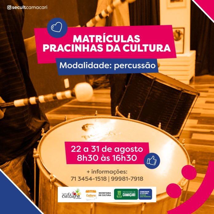 O curso de percussão acontece às terças e quintas-feiras, das 9h30 às 11h. Outras informações podem ser obtidas através do telefone (71) 3454-1518 ou pelo atendimento virtual da Secult, por meio do WhatsApp (71) 99981-7918. A Pracinhas da Cultura fica localizada na Avenida Luiz Gonzaga, s/nº.