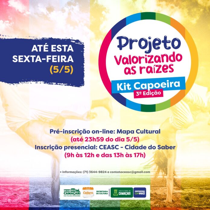 Encerra nesta sexta-feira (5/5) o prazo de pré-cadastro para grupos interessados em ganhar os materiais do Projeto Valorizando as Raízes – Kit Capoeira 2ª Edição, de forma on-line ou presencial. A ação é realizada pela Secretaria da Cultura (Secult) com o objetivo de conhecer as demandas dos grupos de capoeira, na perspectiva de lançamento do regulamento previsto para o final de maio.