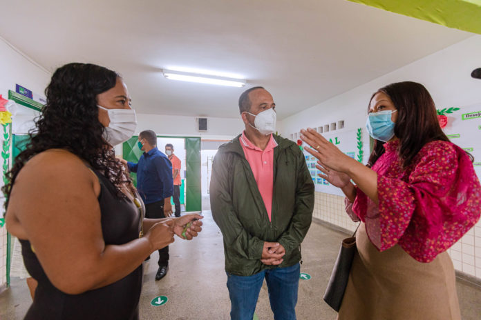 Dando sequência na visita às escolas, como foco no retorno às aulas presenciais, o prefeito Elinaldo Araújo, acompanhado da secretária da Educação, Neurilene Martins, esteve na manhã desta segunda-feira (12/7), na Escola Professora Lídia Coelho Pinto, em Arembepe, costa de Camaçari.