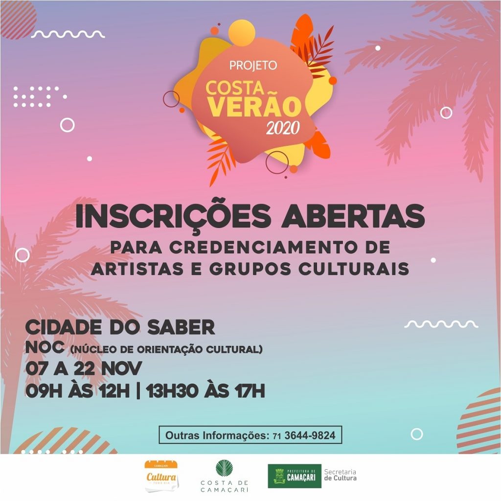 Encerra, impreterivelmente, dia 22/11 (sexta-feira) a inscrição para o credenciamento de artistas e grupos culturais para apresentação nas mostras itinerantes do Projeto Costa Verão, nas lavagens tradicionais e em eventos da Secretaria da Cultura (Secult) que ocorrerão no período de janeiro a março de 2020.