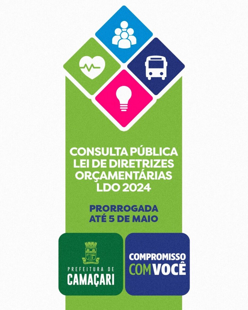 A Prefeitura de Camaçari prorrogou até 5 de maio a disponibilidade da Consulta Pública Eletrônica para participação da população, a fim de elaborar o Projeto de Lei de Diretrizes Orçamentárias (LDO), para o exercício de 2024. Responsável por planejar, organizar e executar a ampla escuta, a Secretaria de Governo (Segov) quer garantir a contribuição representativa dos munícipes, a fim de que a formulação e definição das políticas públicas adotadas sejam fruto de amplo envolvimento social.