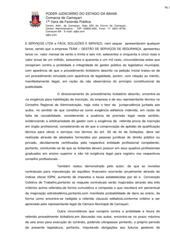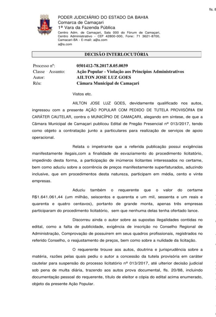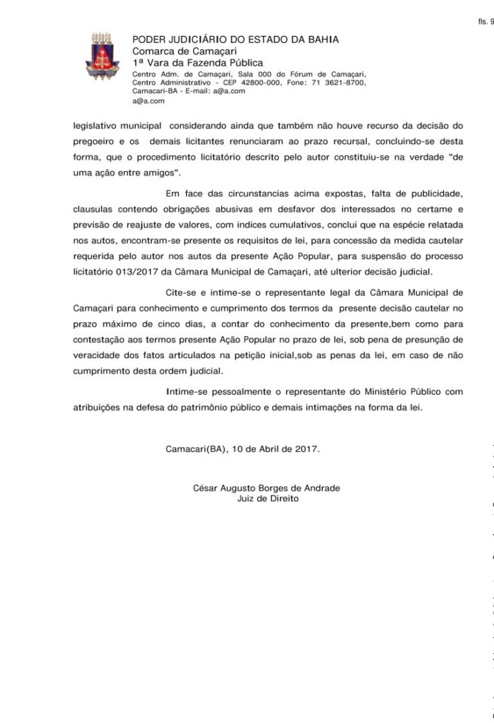 “Concluindo-se desta forma, que o procedimento licitatório descrito pelo autor constituiu-se na verdade ‘de uma ação entre amigos’. Em face das circunstâncias acima expostas, falta de publicidade, clausulas contendo obrigações abusivas em desfavor dos interessados no certame e previsão de reajuste de valores, com índices cumulativos, conclui que na espécie relatada nos autos, encontram-se presente os requisitos de lei, para concessão da medida cautelar requerida pelo autor nos autos da presente Ação Popular, para suspensão do processo licitatório 013/2017 da Câmara Municipal de Camaçari, até ulterior decisão judicial”, determina o juiz Cesar Augusto Borges.