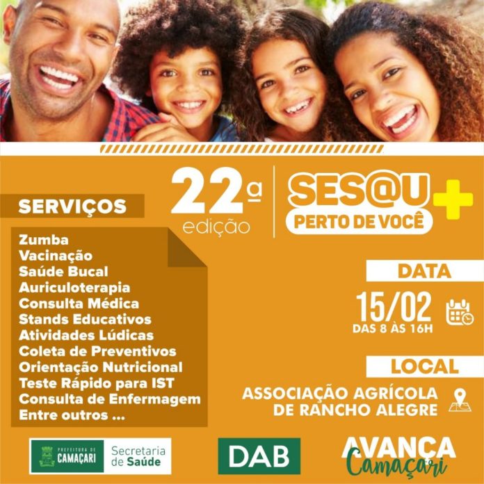 A ação Ses@u + Perto de Você, que em 2019 beneficiou mais de 35 mil pessoas, chega neste sábado (15/2) à comunidade do Rancho Alegre, zona rural de Camaçari, em sua 22ª edição. Das 08h às 16h, equipes da Secretaria da Saúde (Sesau) estarão atendendo a população na Associação Agrícola de Rancho Alegre. A primeira edição de 2020 aconteceu em Mutirão de Catu de Abrantes onde foram atendidas 1.473 pessoas.