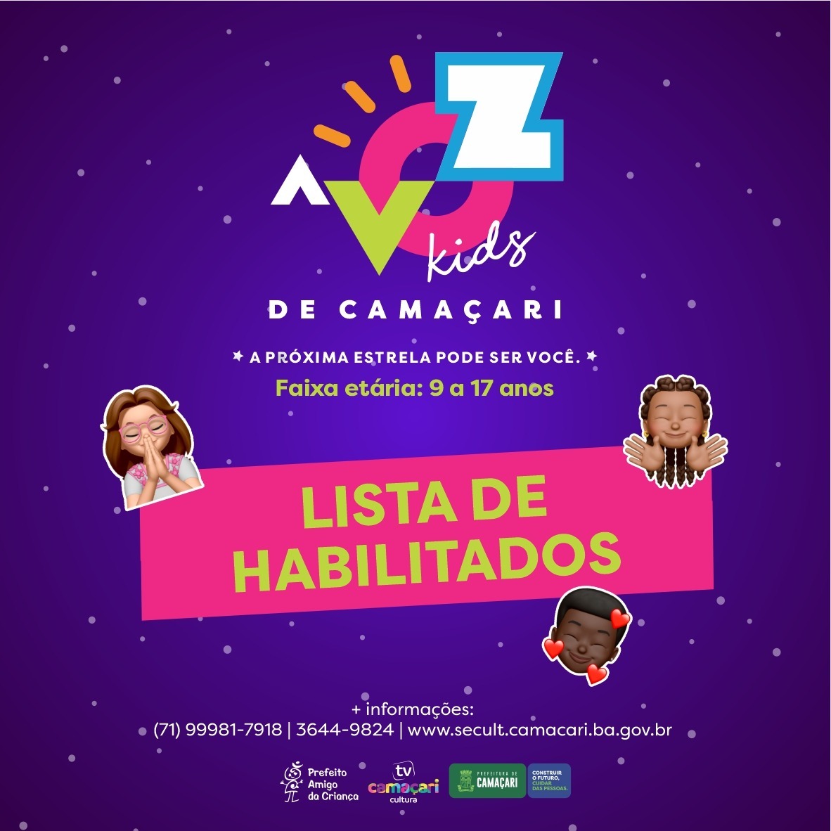 A lista preliminar dos habilitados na fase documental para o concurso cultural A Voz de Camaçari Kids foi divulgada pela Secretaria da Cultura (Secult) através de publicação no Diário Oficial do Município (DOM) desta segunda-feira (30/5). A etapa consistiu na verificação do cumprimento das regras gerais, com o preenchimento de todos os campos da ficha de inscrição e anexos com informações válidas, além do envio da documentação exigida.