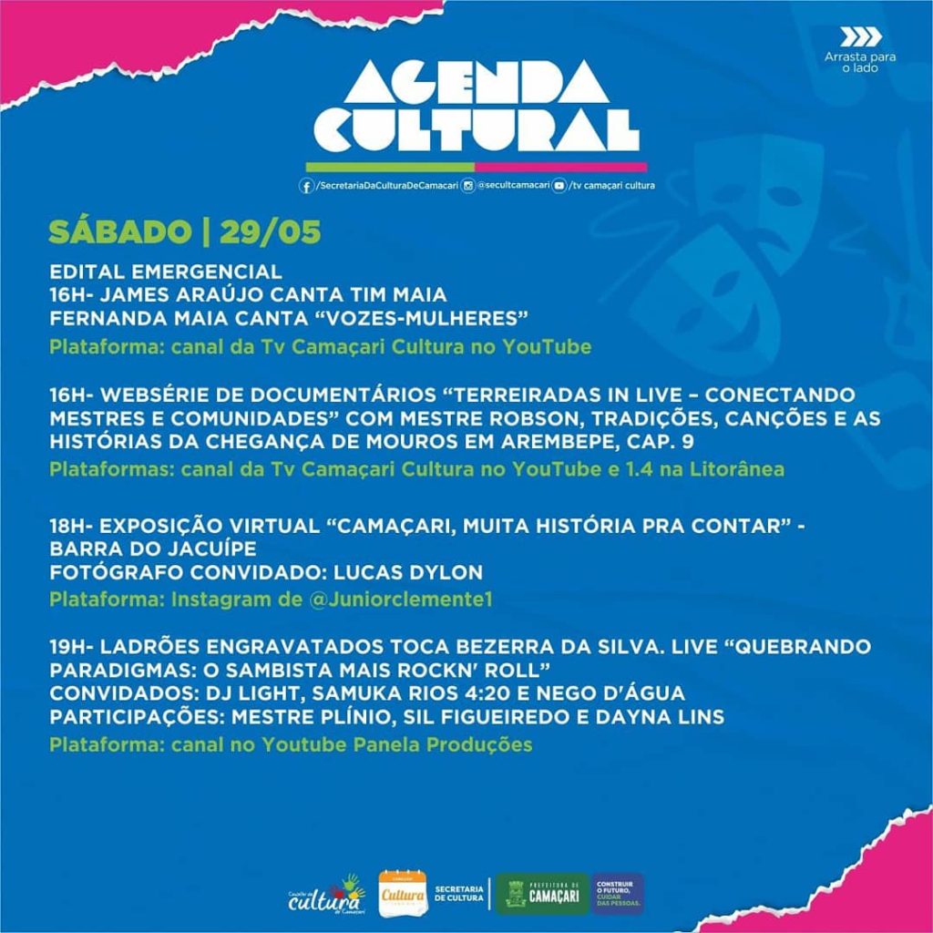 Para o sábado (29/5), a programação é extensa. A partir das 16h, James Araújo canta Tim Maia e Fernanda Maia canta “Vozes-Mulheres”; e ocorre a Websérie de Documentários “Terreiradas in Live – Conectando Mestres e Comunidades”, com mestre Robson, tradições, canções e as histórias da Chegança de Mouros em Arembepe, capitulo 9, ambos transmitidos pelo canal da TV Camaçari Cultura no YouTube e na TV Litorânea.