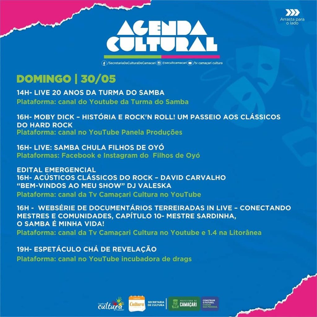 Acústicos Clássicos do Rock – David Carvalho e “Bem-vindos ao meu show” DJ Valeska serão transmitidos, ás 16h, pelo canal no YouTube da TV Camaçari Cultura e 1.4 na TV Litorânea; e para encerrar as atrações do domingo, às 19h, acontece o Espetáculo Chá de Revelação, que será transmitido pelo canal no YouTube Incubadora de Drags.