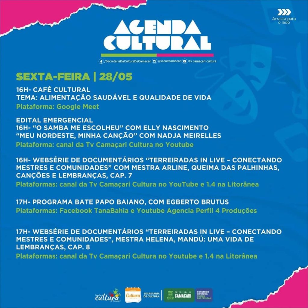 Ainda no dia 28 de maio estão previstas episódios da Websérie de Documentários “Terreiradas in Live – Conectando Mestres e Comunidades”, com mestra Arline, que trará: Queima das Palhinhas, Canções e lembranças, capitulo 7, às 16h; e com mestra Helena, sobre Mandú: Uma vida de lembranças, capitulo 8, às 17h; todos neste dia serão visualizados através do canal no YouTube da TV Camaçari Cultura e 1.4 na TV Litorânea. Pelo Facebook TanaBahia e YouTube Agência Perfil 4 Produções, às 17h, acontece o Programa Bate Papo Baiano, com Egberto Brutus.