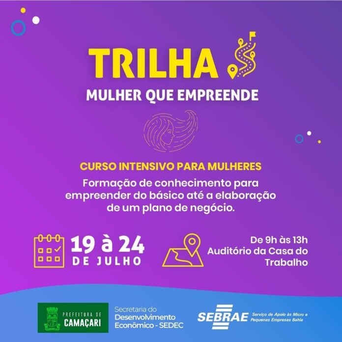 Com o objetivo de promover capacitação, a Prefeitura de Camaçari, através da Secretaria do Desenvolvimento Econômico (Sedec), realizará a Trilha Mulher que Empreende. O curso é intensivo para mulheres e será realizado de 19 a 24 de julho, das 9h às 13h, na Casa do Trabalho, através do convênio com o Serviço Brasileiro de Apoio às Micro e Pequenas Empresas (Sebrae).