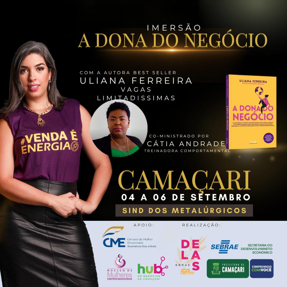 Durante três dias, sempre das 9h às 18h, um grupo de mulheres empreendedoras passarão por um treinamento intenso com Uliana Ferreira, autora do livro “A Dona do Negócio”, considerado um best-seller, devido ao grande número de cópias vendidas. A proposta da atividade é desbloquear o potencial máximo das empreendedoras, em um ambiente estimulante com ferramentas, estratégias e vivências impactantes.
