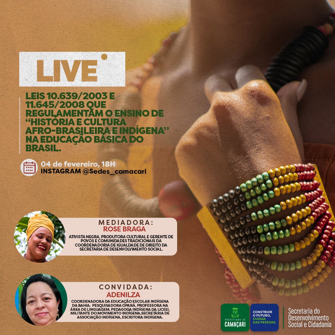 Em alusão ao Dia Nacional de Luta dos Povos Indígenas, celebrado no dia 7 de fevereiro, a Secretaria do Desenvolvimento Social e Cidadania (Sedes) realizará nesta sexta-feira (4/2), às 18h, uma live com o tema: Leis 10.639/2003 e 11.645/2008 que regulamentam o ensino de “História e Cultura Afro-Brasileira e Indígena” na educação básica do Brasil. A transmissão será através do perfil da Sedes no Instagram (@sedes_camacari).