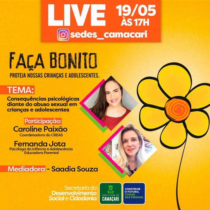 A Secretaria do Desenvolvimento Social e Cidadania (Sedes), por meio do Centro de Referência Especializado de Assistência Social (Creas), realiza nesta quarta-feira (19/5), às 17h, uma live com o tema “Consequências psicológicas diante do abuso sexual em crianças e adolescentes”. O evento será exibido no perfil da pasta no Instagram (@sedescamacari) e faz referência ao Maio Laranja, campanha que amplia para todo este mês a mobilização inspirada pelo 18 de maio, Dia Nacional de Combate ao Abuso e Exploração Sexual de Crianças e Adolescentes.