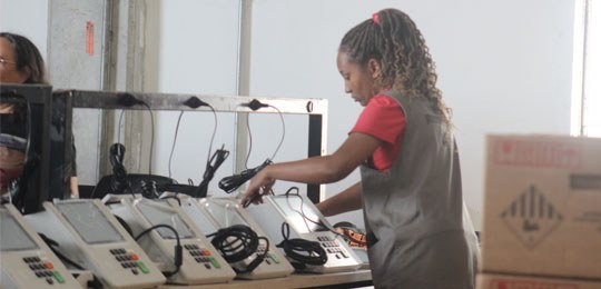 Pra todos verem: colaboradora da Justiça Eleitoral manuseia urna eletrônica disposta em uma fila com outros dispositivos de votação.