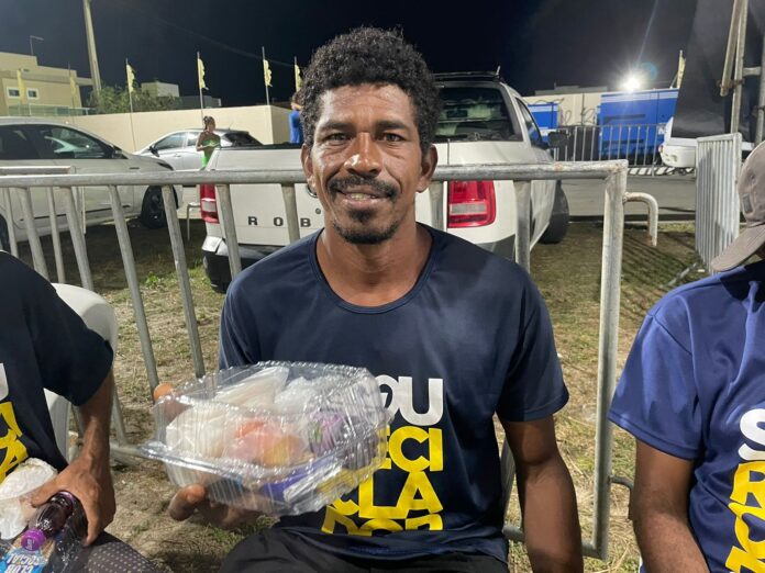 Trabalhando com a ajuda da esposa, Edinaldo dos Santos Rodrigues foi um dos recicladores beneficiados pela ação. Ao fazer um lanche, enquanto descansava no estande da Limpec, após um longo dia de trabalho, ele disse estar muito satisfeito com o programa. “Fui bem recebido aqui. Realizei todas as refeições e recebi o apoio da equipe. Tudo está bem organizado. O material dado no kit [catador] foi de grande ajuda, principalmente a sacola de coleta, onde estou guardando o que coletei para vender depois da festa. Enquanto eu recolho o material, minha esposa toma conta das sacolas”.