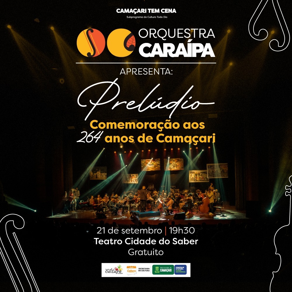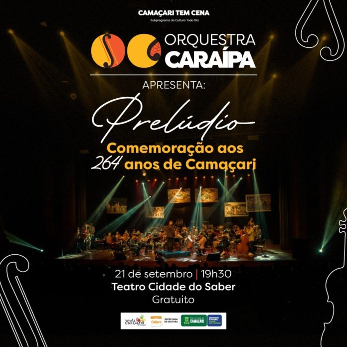 Nesta quarta-feira (21/9), às 19h30, a Orquestra Caraípa apresenta no Teatro Cidade do Saber, o concerto Prelúdio, celebrando os 264 anos de emancipação política de Camaçari, comemorado em 28 de setembro. O evento tem entrada gratuita e os ingressos devem ser retirados na bilheteria da Cidade do Saber, no dia da apresentação, a partir das 16h, até o horário do espetáculo.